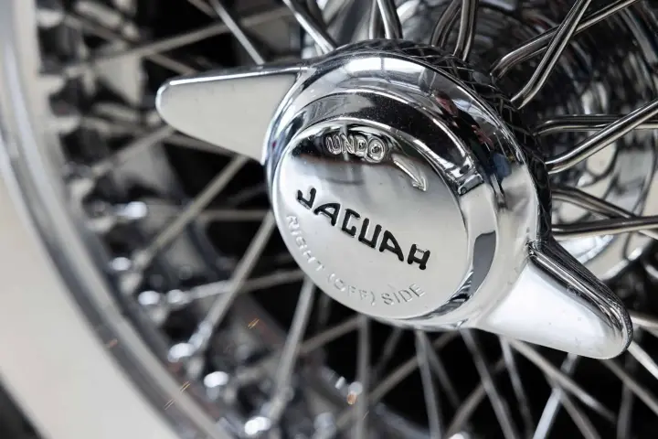 During the process, the Jaguar was equipped with high-quality components and finished with luxurious leather upholstery by an interior specialist. The exclusive Golden Sand color, from Jaguar's palette, was even applied to the original hardtop for a harmonious look. The whitewall tires complete the car.
