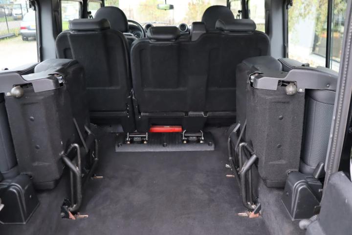 This Defender has a beautiful and rugged appearance, finished in all black. The deep black colour has a beautiful shine and the visual condition is very good with only minimal signs of wear. The 15-inch alloy wheels are in top condition. Running boards on the sides give the car an extra robust look. At the rear, there is a step for the rear passengers, a tow bar and a spare wheel. The lights and rubbers are in good condition.