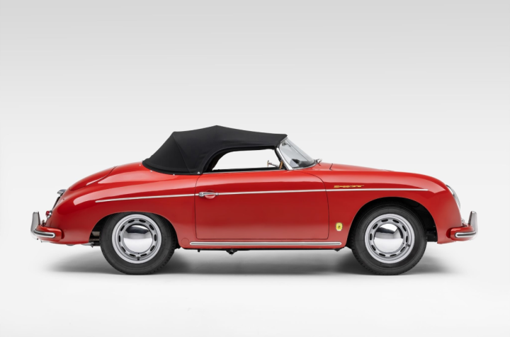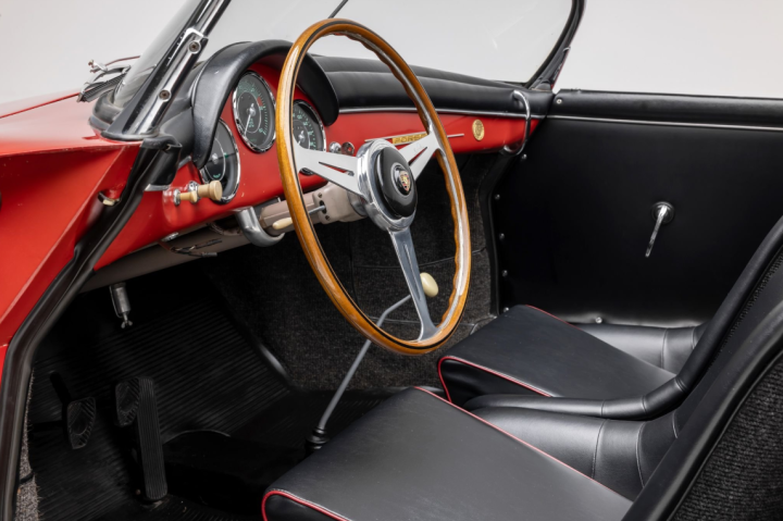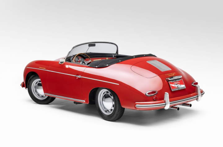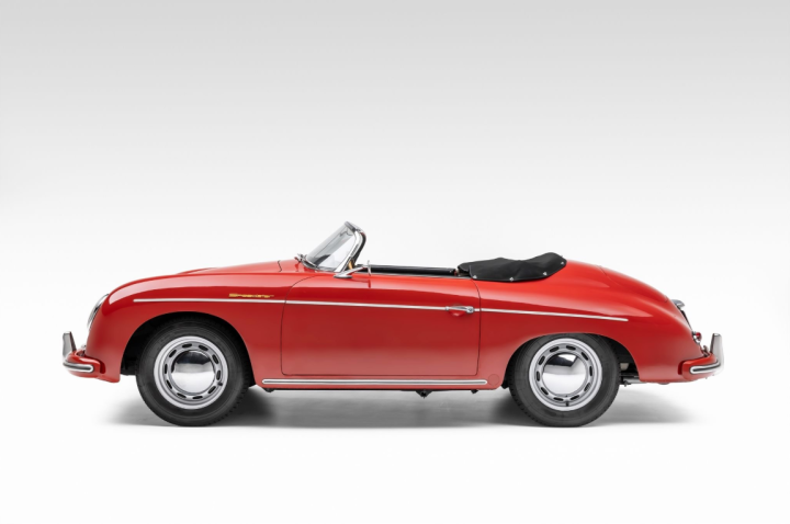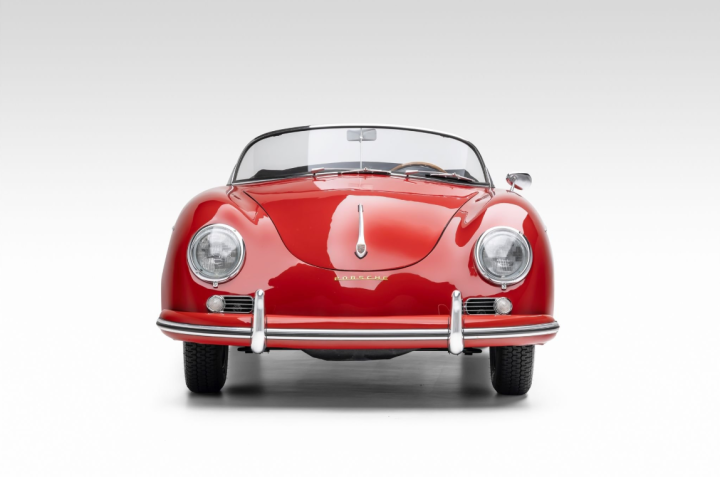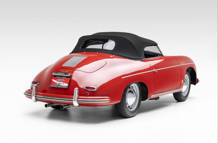 This 1957 Porsche 356A Speedster was completed on April 5, 1957. It was originally fitted with engine number 65073 and transmission number 13944, both matching numbers that remain in the Speedster today. It is a US example imported by Hoffman Motor Company in New York with sealed beam headlights and USA bumpers. It was originally finished with a white exterior and a red interior.
