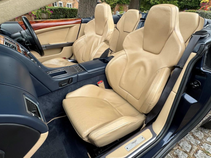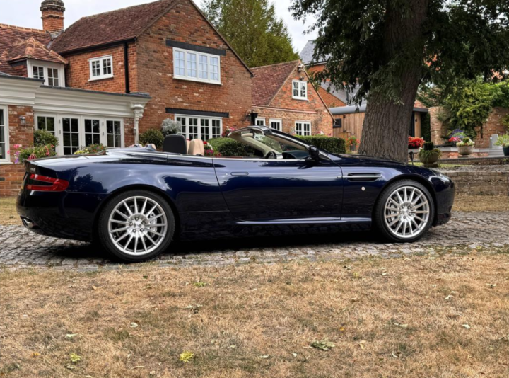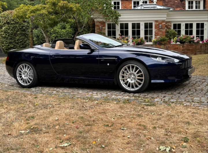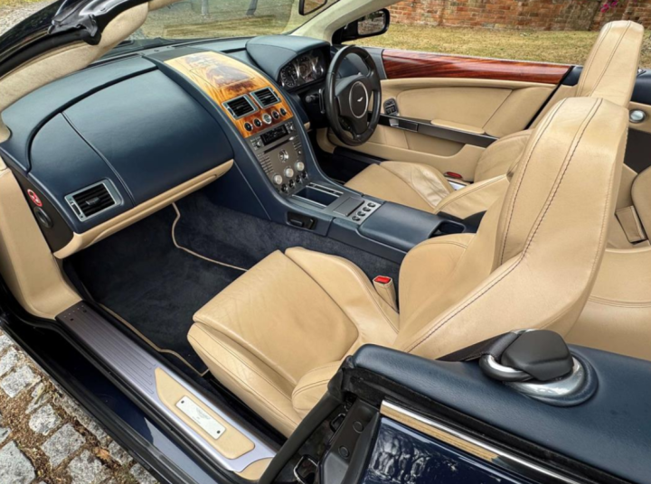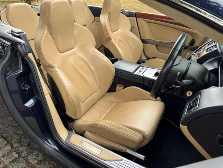 2006 Aston Marin DB9 Volante, finished in Midnight blue with contrasting Sandstorm hide interior with best quality dark blue Wilton carpet throughout. In addition, it has Walnut veneers to the centre console and door cappings, all of which are in lovely condition.. This is a beautiful, well-kept and well serviced example that has had only 3 previous keepers in 19 years. The mileage covered is just over 36,000, which is “Just Run-in” for the V12 5.9 litre Aston Engine and therefore still performing perfectly. The mileage is backed up by the DVLA MOT records, together with a stamped-up service book containing 15 service stamps and a number of corresponding service invoices. Fitted with the more desirable, paddle-shift automatic transmission making this car extremely easy to drive. It has the benefit of 19” multi spoke, sports alloy wheels shod with the correct Bridgestone Potenza speed rated tyres, all of which are in excellent condition. In addition, it has heated electric seats with lumbar support, Powerfold mirrors, fitted wind deflector, an indoor car cover, a battery charger, and an electric tyre inflator. This superb DB9, now represents exceptional value for money for one in this condition at only £31,950. It comes with a 6 month warranty for added peace of mind.