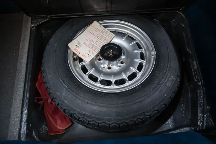 The paint is magnificent as is the leather interior, door cards ,soft top ,interior wood trim, gauges, and crack free dash. Tires are deep in tread. All bright work is perfect. Wheel finish is as new.