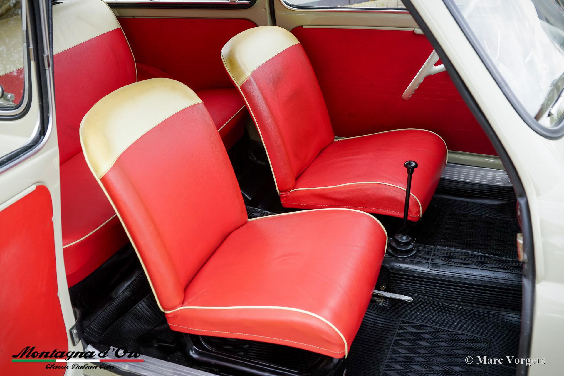 Fiat 120 Nuova 500 Giardiniera, jaar 1965. Chassisnummer Fiat120*144869*, motornummer 120000*243877*. Carrosseriekleur warm grijs (beige) gecombineerd met een rood/crème kunstlederen (vinyl) interieur afgewerkt met zwart rubberen tapijt.