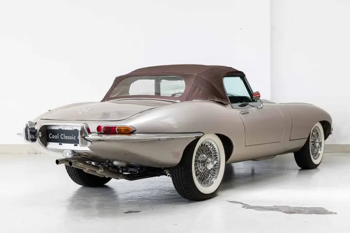 During the process, the Jaguar was equipped with high-quality components and finished with luxurious leather upholstery by an interior specialist. The exclusive Golden Sand color, from Jaguar's palette, was even applied to the original hardtop for a harmonious look. The whitewall tires complete the car.
