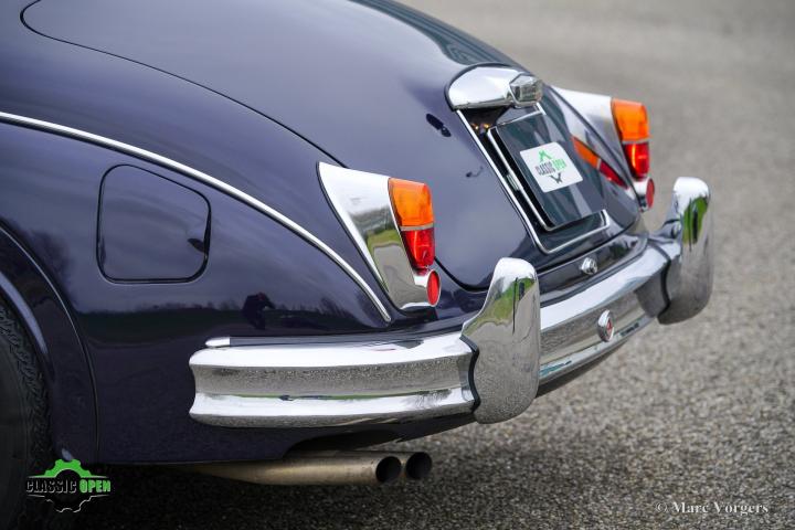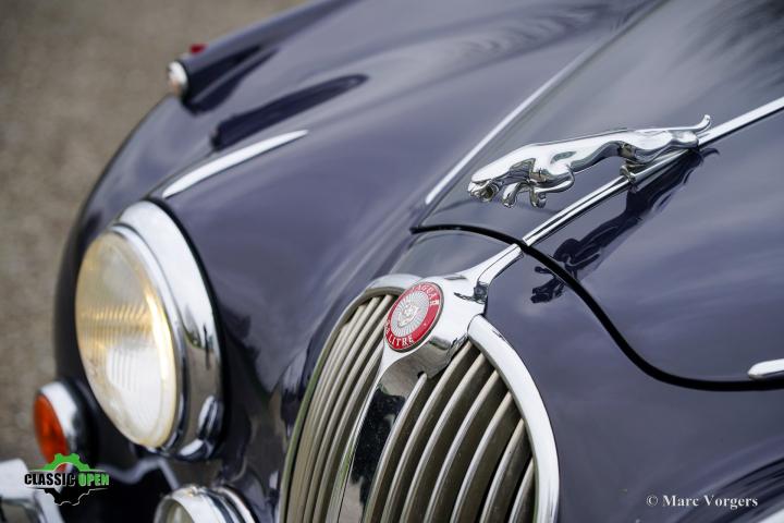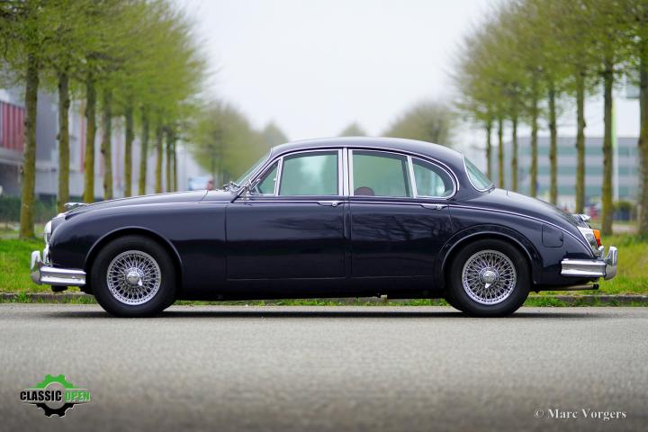 Exterieur uitgevoerd in donkerblauw, geaccentueerd door een roodlederen interieur en rode vloerbedekking. Deze fraaie Jaguar Mk II werd nieuw geleverd in de VS. De auto werd in 2006 geïmporteerd in Nederland en is sinds 2014 in het bezit van één zorgvuldige eigenaar.