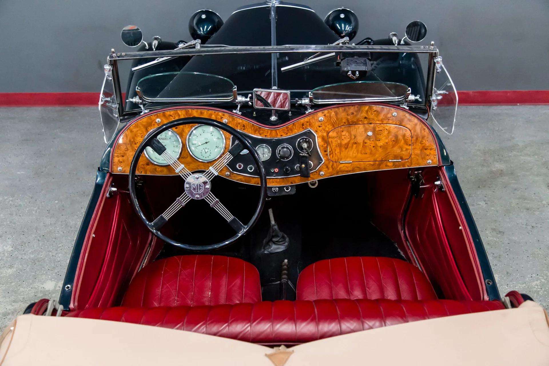 This aggressive stance MG TD has been restored and painted in a very favorable Lexus metallic green over deep red leather interior.