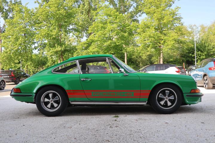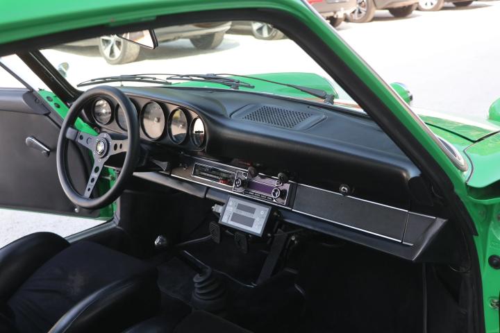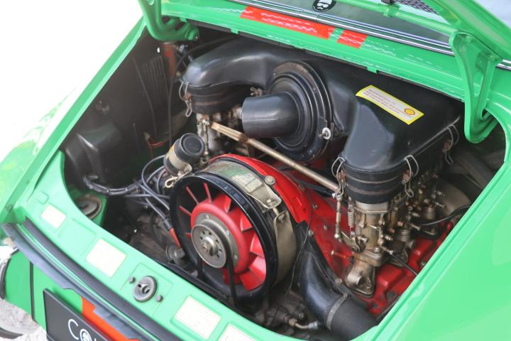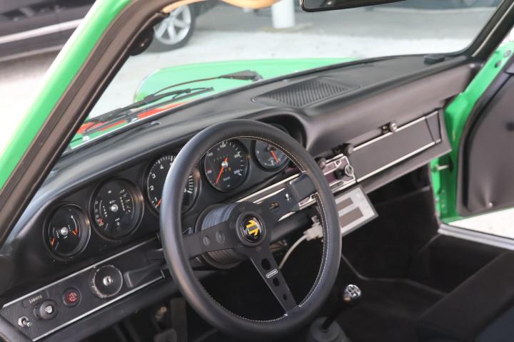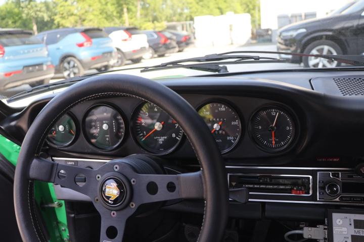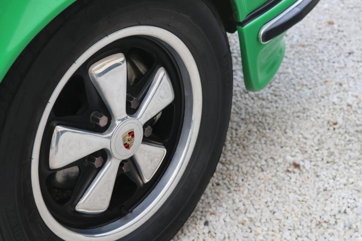 Unfortunately, not much is know about the history of this 911. It was imported into Europe several years ago and came into possession of the last owner in 2019. By this point, the car had undergone a complete restoration and was finished in Viper Green. This is an original Porsche colour and this suits the sporty character of the car very Well. To further enhance the looks of the car, the decision was made during the restoration to upgrade the car to ‘RS’ looks. This can be seen on the front spoiler of the car and also the addition of a ducktail spoiler in the rear. The ducktail is currently not fitted to the car, but Will be provided with the car and can be fitted easily. To further enhance the sporty look, the last owner decided to add orange Racing stripes to the top and sides of the car. It might seem as a strange combination of colours, but this works very Well with the Viper Green colour. Looking at the front of the car we can also find Some classic Cibie Pallas fog lights. These were a very popular accessory in period and give the car a more racy look without being over the top. On the Side of the car we can find the desirable and iconic Fuchs wheels that are a must have on a 911.