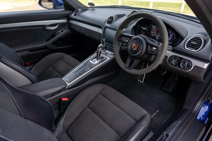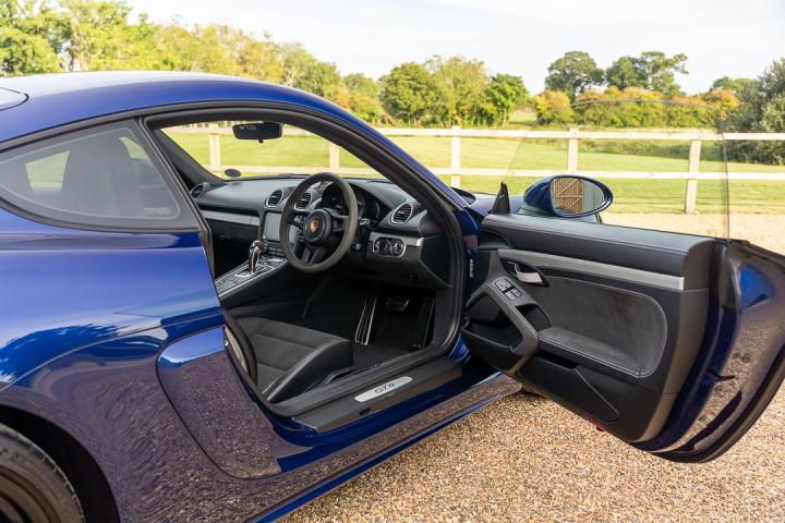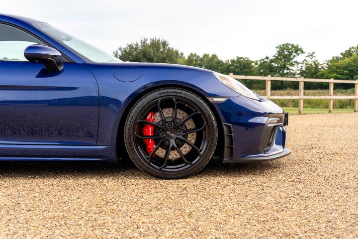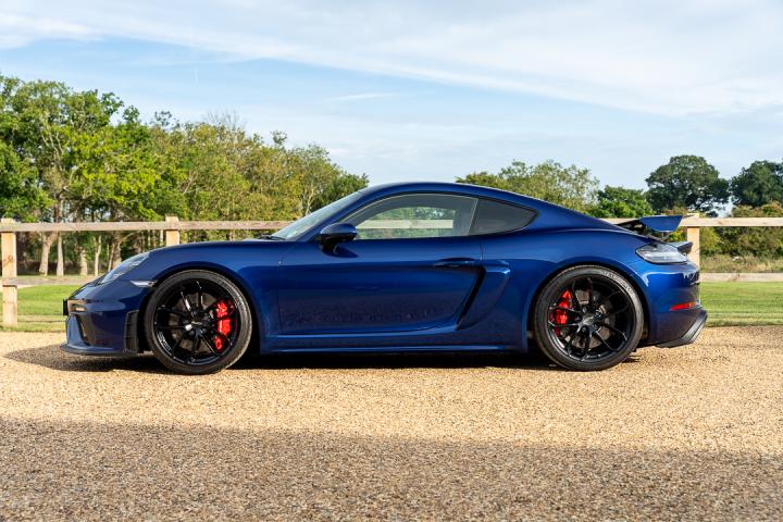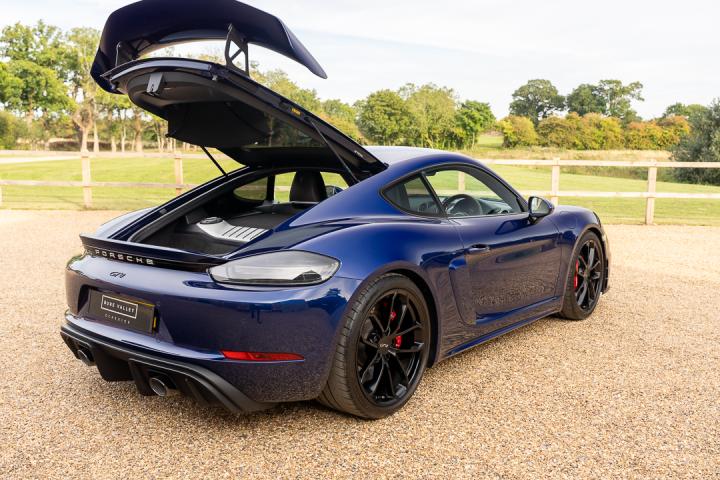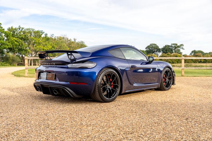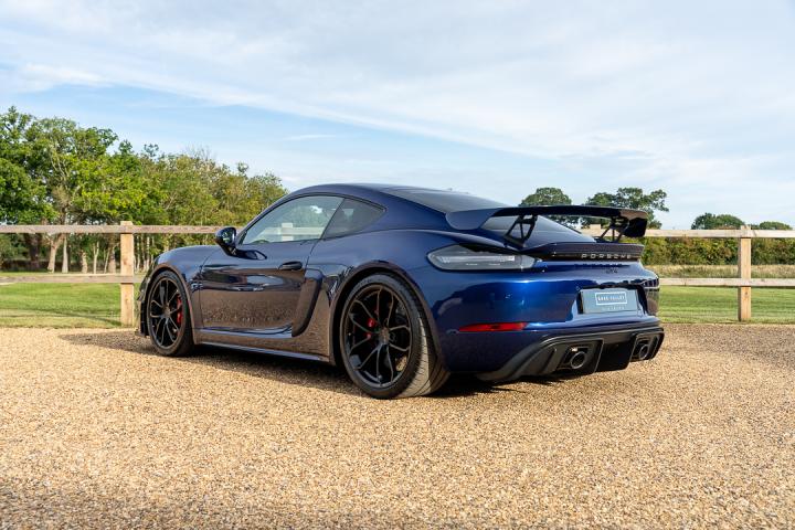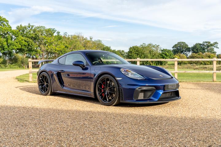 A superb example of the 718 Cayman GT4, finished in Gentian Blue Metallic with a Black Race-Tex interior, black leather accents and contrasting silver stitching. Powered by the 4.0-litre flat six producing 420bhp, paired with the lightning fast PDK transmission, this GT4 delivers an exhilarating and precise driving experience. The car is presented in exceptional condition throughout and benefits from a professional exterior detail including two stage paint correction and ceramic coating, leaving the Gentian Blue paintwork looking exceptional. Registered in 2022 and showing just 9,971 miles, this car comes with a full Porsche service history. The most recent service was completed in March 2024 at 6,028 miles, with PADM mounts replaced under warranty and a full health check in April 2025. MOT runs until March 2026, and Porsche Warranty is valid through to the end of March 2026.