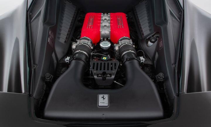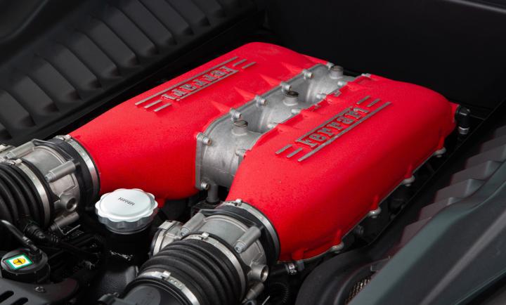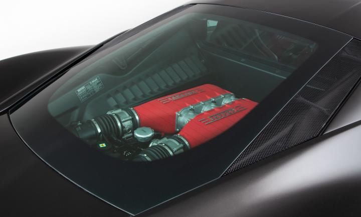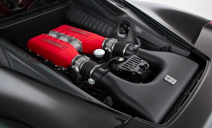 The Ferrari engine presents as a work of art, pride of place under the glass rear cover, with the extroverted details the Italian marque is known for.