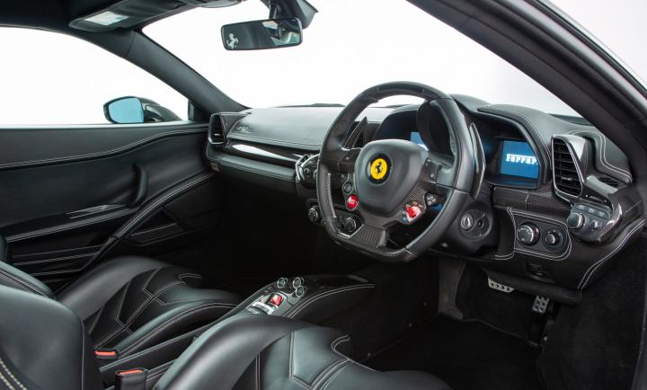 The cabin of this 458 is exceptionally well appointed with a tasteful mix of Carbon Fibre Racing seats in Nero leather with a contrast stitch as well as plenty of alcantara. The driving position is absolutely spot on with all controls falling easily to hand β a real ergonomic triumph that has survived well over time. The steering wheel feels beautiful to hold, with a perfect rim diameter, again finished in a combination of carbon fibre shrouded in alcantara.