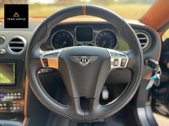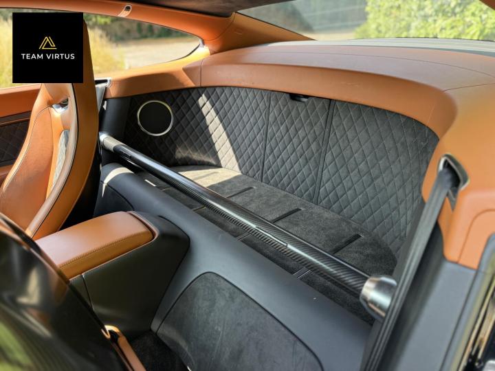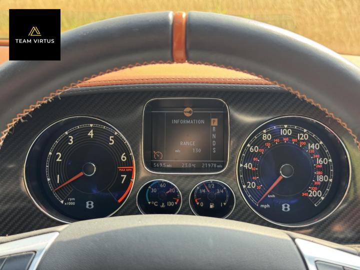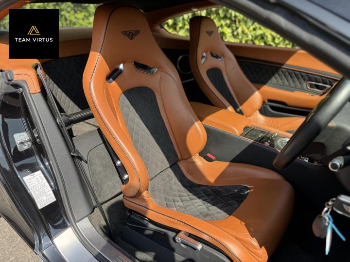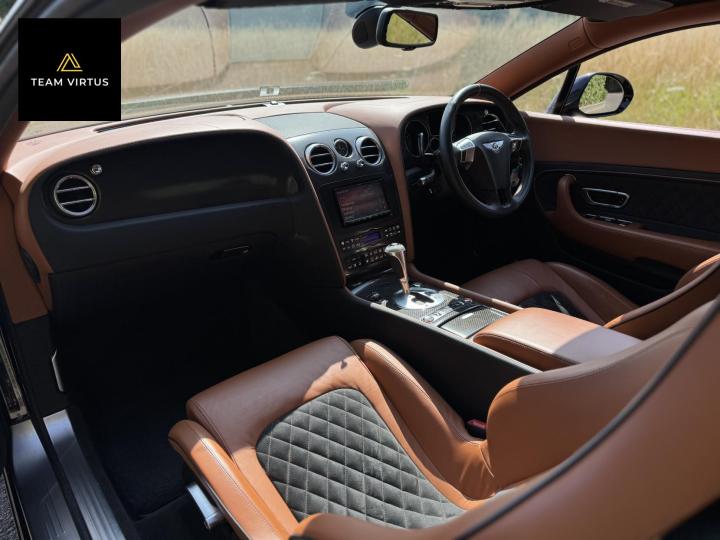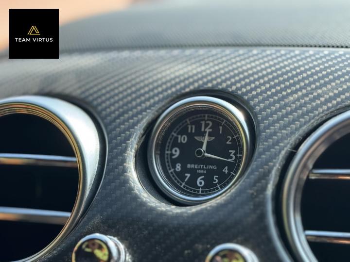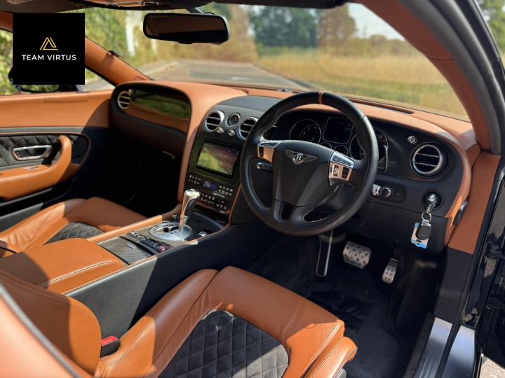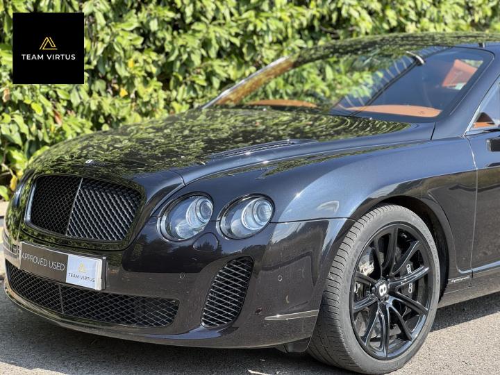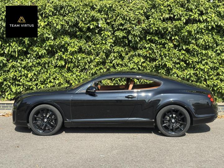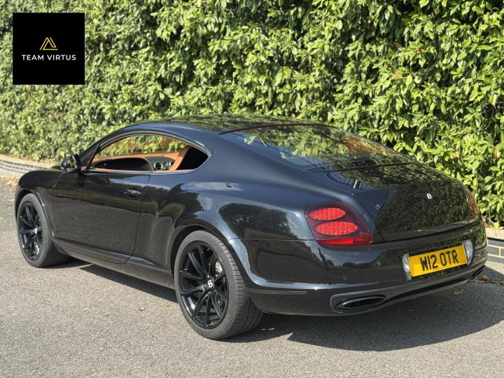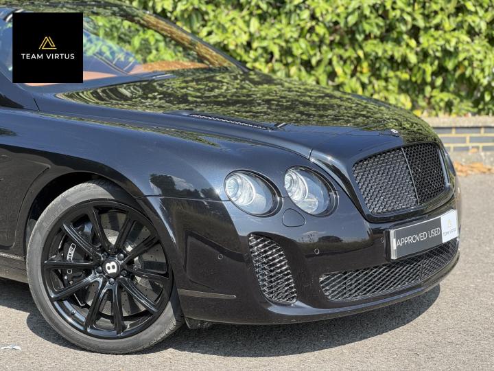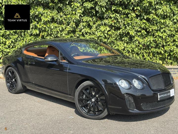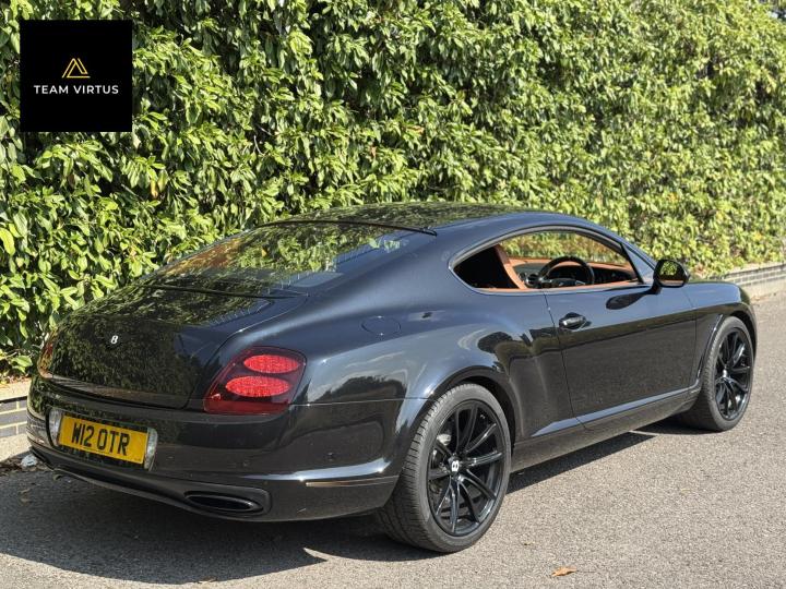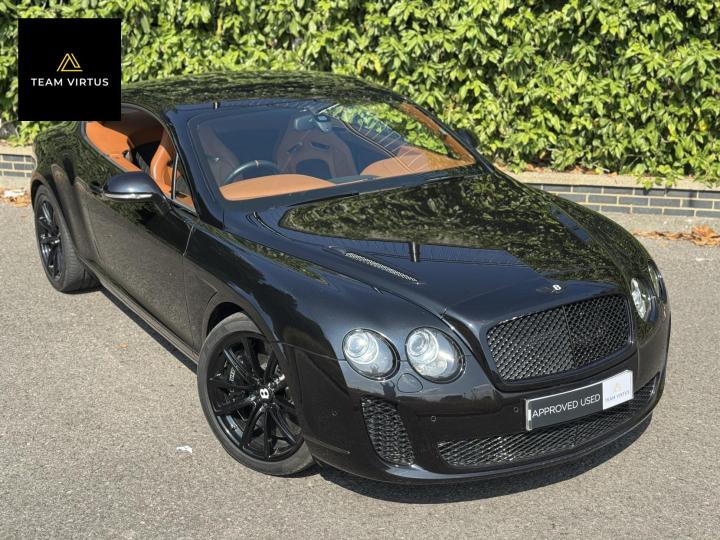 Unveiled in 2003 at the Geneva Motor Show, the Continental GT was a different animal. The Crewe-built cars numbers were impressive with the twin-turbo, VAG 6.0 litre W12 engines, developed in the VW Phaeton and stillborn W12 sports car, producing 552bhp and 479lb ft torque. This prodigious output was fed through a six-speed automatic box from the new A8 and distributed by the Quattro four-wheel drive system. 0-60 in 4.7 seconds and a top speed of 196mph were significant for a car of this stature. Some six years later, also in Geneva, Bentley unveiled their new 621bhp Continental Supersports which was indecently quick with 0-60mph in 3.7 seconds and a top speed of 204 mph, making it the fastest and the most powerful production Bentley ever. With a revised 'Tiptronic' automatic gearbox employing a 'quick-shift' system, gear change times were reduced by 50%. In order to cope with the increased power, it was necessary to have carbon fibre reinforced silicon carbide ceramic disc brakes - the largest and most powerful brakes ever fitted to a production car. As the Supersports evolved Bentley managed to accidentally create a very limited-edition car, the two seat examples were not selling as hoped because at the time most of the Bentley ownership comprised a demographic of drivers who wanted four seats and a softer ride. Enter the SuperSport ‘comfort seat’ option, a four-seat option that still gave performance, clearly not that of the two-seater but it gave a very clean way for Bentley to exit what appeared to be a fabulous car but not for their then customer demographic, thus leaving those with the full two-seat example with a low production car and now highly desirable. This stunning low mileage Bentley Continental Supersports is a 2010, UK supplied, right hand drive example finished in metallic Onyx Black with Beluga and Newmarket tan leather trim. Presented with a pair of heated, two-piece, carbon fibre sports seats and Breitling analogue clock sitting above the £5,000 uprated NAIM premium satellite navigation by Bentley Bristol. Upgrades by Bentley have not stopped there, originally a Bentley Pangbourne demonstrator car, as many options as possible were specified including a Bentley warrantied and fitted Acropovic exhaust system which was circa £7,000 alone and added between 7-12bhp along with an uprated leather steering wheel. Where rear passengers would normally reside, a carbon fibre cross-brace spans the cabin, generating torsional rigidity, showing the real intent of the 'Supersports', this is a rarity now as many cars were converted by Bentley to four seat cars to help sales. Sitting on 20" alloy wheels, the car is fitted with carbon-ceramic brakes, adjustable suspension and a host of other options making it, effectively, a very luxurious 'Group A Touring Car' for the road with incredible power. Serviced at 98, 344, 2550, 3559, 4592, 5079, 5992, 7402, 11745, 13567, 16702, 18473, 20713 and 21399 – boasting an all-Bentley main dealer history, the latest the larger of the scheduled carried out in February 2024. Supplied with its driver's manuals, spare keys, service book and a UK V5C registration document,this fantastically quick car would put a smile on any driver's face. We welcome any inspection of this amazing, showroom condition, Bentley with the W12 cherished plate included in the sale.