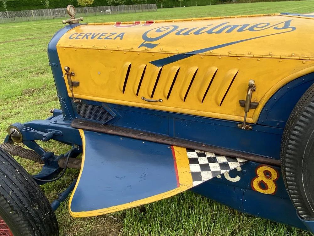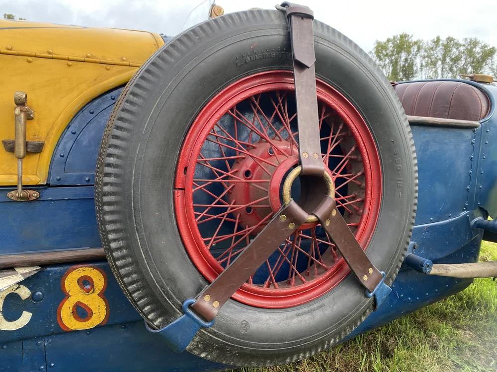 As the car is running quite fast due to all the modifications done, the brakes were modified for hydraulic brakes and foreseen of Alloy drums all around for better brake performance. As for the road handling, the leaf springs have been equipped with Hartford friction shocks in the front and rear. The 18-inch spoke wheels are fitted with BF Goodrich tires, and the car has been given an identical spare wheel. Other details contributing to the fantastic looks of the car are the leather tool bag on the driver's side, the brass finishing, the dark red leather interior, the little windscreen and its paintwork. A full tonneau cover is provided with the car to protect on rainy days.