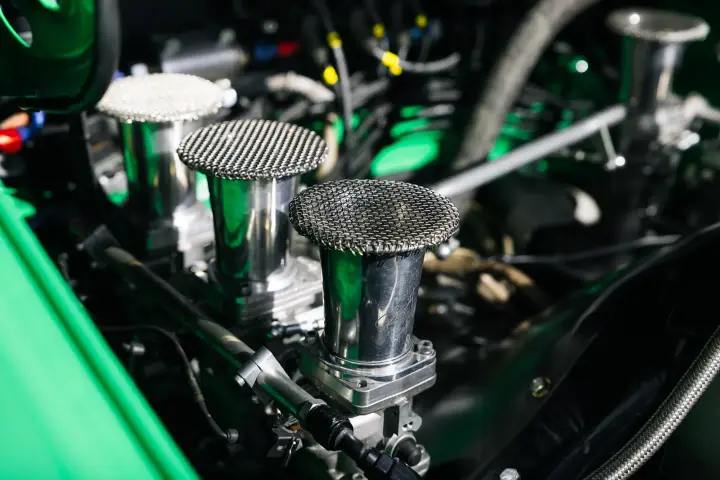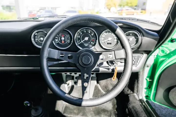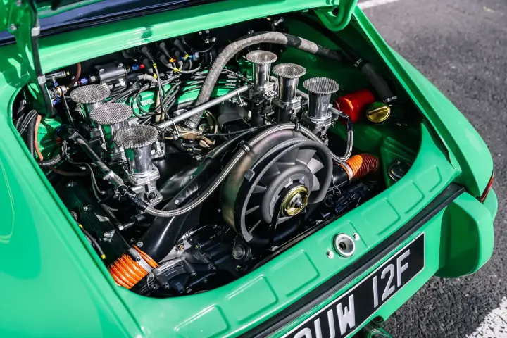 The engine is a fully rebuilt 3.2 Litre Flat-Six, but also now benefits from Jenvey Throttle Bodies. Founded in 1987, this world-famous throttle body and fuel injection system manufacturer has forged an enviable reputation for delivering high- quality housings, spindles, butterflies, levers and fuel rails for all manner of road and race cars, including air- cooled Porsches. The two-stud kit installed in the green machine’s engine bay comprises six of the Shropshire company’s SF throttle bodies, a specially balanced linkage kit, inlet manifolds, fuel rails, fuel rail mounts and a set of ninety-millimetre air horns.